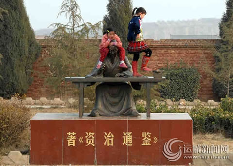 2月23日,在夏县司马温公祠景区,两名学生爬上“正在作书的司马光”铜雕上,一名学生甚至骑到“司马光”脖子上玩耍。另一侧,一个大人领着小孩同样跳入司马光砸缸的铜雕缸内玩耍。